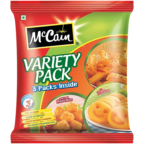 McCain Variety Pack - Chilli Garlic Potato, Smiles & Masala Fries, 550 g PouchMcCain Variety Pack – Chilli Garlic Potato, Smiles & Masala Fries, 550 g Pouch